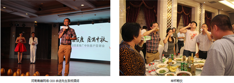 一杯杯酒,一首首歌,道不盡的問候,送不完的祝福,在這收獲的季節(jié),讓我們共同舉杯,祝福彼此。通過本次答謝會,進(jìn)一步溝通了客服人員與客戶的感情,也更加鞏固了百度推廣在客戶心中的品牌形象,堅(jiān)定了他們與百度攜手,從一個成功走向另一個成功的信心!