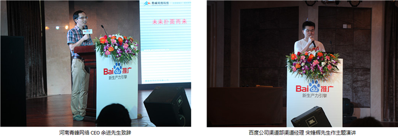 蒞臨本次答謝會現(xiàn)場的領(lǐng)導(dǎo)有:百度公司渠道部渠道經(jīng)理宋鋒輝先生,百度公司業(yè)務(wù)運(yùn)營部區(qū)域經(jīng)理何蓓女士,河南青峰網(wǎng)絡(luò)科技有限公司CEO 余進(jìn)先生。會議前半場,青峰網(wǎng)絡(luò)CEO余進(jìn)先生致開場詞,并帶來了《未來撲面而來》的精彩演講,帶領(lǐng)與會嘉賓一起回顧了互聯(lián)網(wǎng)發(fā)展的潮流,并以自己多年互聯(lián)網(wǎng)從業(yè)經(jīng)驗(yàn),預(yù)測未來互聯(lián)網(wǎng)發(fā)展的趨勢,引得臺下陣陣掌聲。接下來,由百度公司渠道部渠道經(jīng)理宋鋒輝先生帶來主題演講,宋經(jīng)理向到場的嘉賓介紹了百度2013年在各領(lǐng)域取得的巨大成就,并著重介紹了百度推廣新推出的品牌起跑線、問答營銷、企業(yè)之窗等新產(chǎn)品,擴(kuò)大了客戶網(wǎng)絡(luò)營銷的視野,堅(jiān)定了與會嘉賓與百度推廣一起成長的信心。