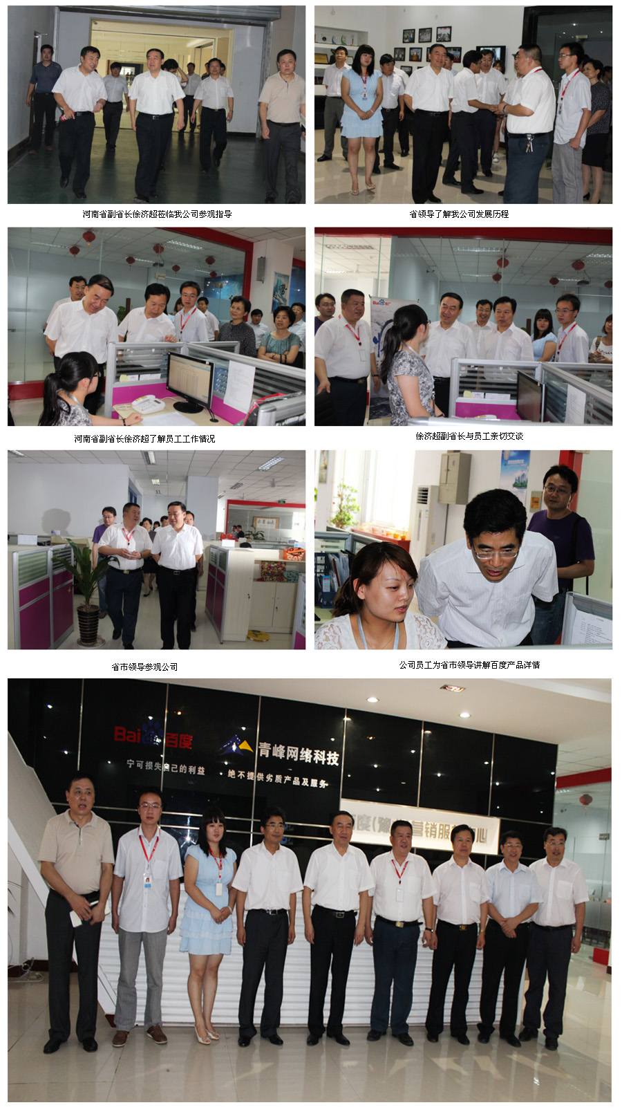 2012年7月12日,在新鄉市市委書記李慶貴、市長王戰營、高新區管委會主任王兵法、書記劉慶貴等相關領導的陪同下,河南省副省長徐濟超帶隊的省企業參觀團一行,蒞臨新鄉市青峰網絡科技有限公司參觀指導,徐濟超副省長詳細詢問了我公司發展歷程,企業規模等情況,與公司員工親切交談,并提出省市各級政府今后工作中將“突出企業,企業為先”幫助企業不斷發展,對青峰網絡科技有限公司的發展、進步表示贊許與鼓勵。
